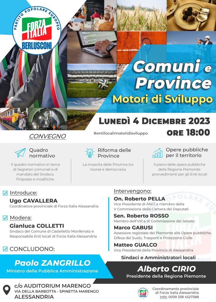 LUNEDI’ 4 DICEMBRE p.v. alle ore 18:00 presso l’Auditorium “Marengo” di Spinetta Marengo sito in via della Barbotta in ALESSANDRIA (Castello di Marengo), il Coordinamento provinciale di Forza Italia Alessandria in collaborazione con l’associazione A.N.A.S. di Alessandria, organizzano un convegno dal titolo “COMUNI e PROVINCE, MOTORI DI SVILUPPO”. Per approfondire questo importante argomento prenderà parte all’incontro il Ministro della Pubblica Amministrazione sen. Paolo ZANGRILLO. Al convegno, aperto a tutta la cittadinanza, saranno inoltre presenti le rappresentanze economico-produttive. L’occasione sarà utile per discutere ed approfondire insieme le tematiche più attuali riguardanti gli Enti locali. In particolar modo il convegno si svilupperà su tre macro tematiche relative al quadro normativo in tema di Segretari comunali e di mandato dei Sindaci, di riforma per il riassetto delle Province e del piano delle Opere pubbliche della Regione Piemonte. Ad arricchire gli interventi, tra gli altri, saranno presenti il Presidente della Regione Piemonte Alberto CIRIO, il Vice Presidente di ANCI On. Roberto PELLA, il sen. Roberto ROSSO, l’Assessore regionale del Piemonte Marco GABUSI e il Vice Presidente della Provincia di Alessandria Matteo GUALCO. Introdurrà i lavori plenari il Coordinatore provinciale di Forza Italia Alessandria Ugo CAVALLERA e modererà il dibattito Gianluca COLLETTI Responsabile Enti locali di Forza Italia Alessandria e Sindaco del Comune di Castelletto Monferrato. L’occasione – commenta Ugo CAVALLERA – sarà utile per approfondire l’importante tematica riguardante il ruolo degli Enti locali nel nostro territorio. Il lavoro degli Amministratori locali interessa direttamente famiglie ed imprese, grazie all’intervento del Ministro Paolo Zangrillo acquisiremo informazioni aggiornate sulla pubblica amministrazione declinandole all’esigenze non solo degli Amministratori locali ma anche del nostro tessuto sociale ed economico-produttivo. A seguito dei continui aggiornamenti del quadro normativo – conclude Gianluca COLLETTI – i nostri Sindaci hanno la necessità di essere sostenuti nel loro compito di Amministratori. I Sindaci svolgono innumerevoli attività nel loro territorio di competenza: sono i responsabili della sicurezza e della salute pubblica, curano e gestiscono l’ambiente e la difesa del territorio, sono i preposti di Protezione Civile, gestiscono le scuole dell’obbligo, si occupano di sviluppo economico e sociale ed altro ancora. Pertanto è necessario mettere al centro della politica locale, regionale e nazionale il ruolo degli Amministratori locali per raggiungere tutti gli obiettivi di sviluppo indicati dalle linee guida nazionali ed europee. Infine a seguito della nefasta riforma Del Rio rimane di estrema importanza la situazione attuale delle Province, le quali hanno visto un significativo taglio dei trasferimenti economici/finanziari senza però alleggerirne i compiti fondamentali e strategici per la corretta gestione del territorio. La discussa prossima riforma che potrà riavvicinare la politica locale ai cittadini con il ritorno al voto per le Province, sarà oggetto di discussione al convegno di lunedì 4 dicembre p.v.