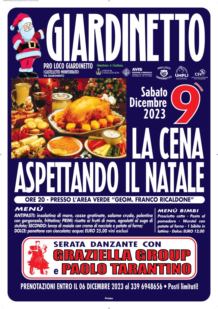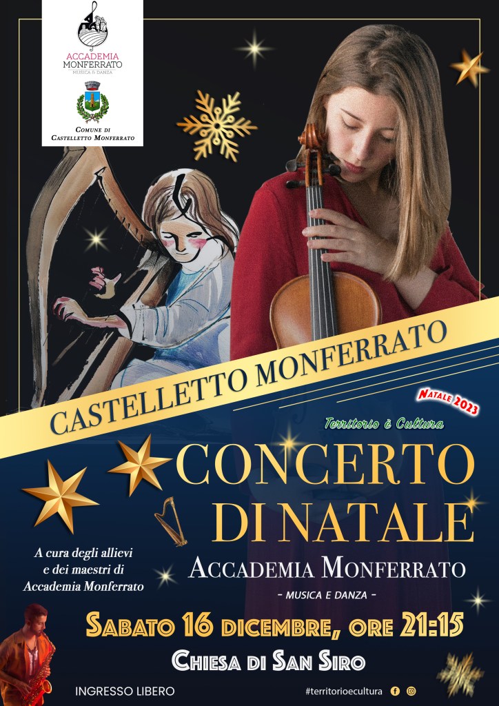 Arriva il Natale ed immancabilmente a Castelletto Monferrato ritorna la kermesse “Territorio è Cultura, Natale 2023”. A partire da venerdì 8 dicembre p.v. il paese monferrino inizierà i festeggiamenti con l’accensione delle luminarie natalizie insieme ai bambini delle scuole materne ed elementari, per poi proseguire con innumerevoli eventi enogastronomici, musicali, letterari e turistici. Il 9 dicembre si terrà una serata enogastronomica “Aspettando il Natale” presso la sede Avis in frazione Giardinetto, il 10 dicembre si terrano i festeggiamenti del Santo Patrono “San Siro” con la Santa messa alle ore 10:30 insieme al Vescovo di Chiavari Mons. Giampio Devasini, a seguire verrà inaugurata la mostra fotografica di Alberto Maffiotti “Respirare il Monferrato” e allestita nella sala Consiliare municipale. Sabato 16 dicembre doppio appuntamento, al circolo S.o.m.s. di Castelletto Monferrato alle ore 20:00 si terrà la serata enogastronomica “La Polenta di Santa Claus” mentre alle ore 21:15 nella Chiesa di San Siro l’associazione “Accademia Monferrato” organizza un “Concerto musicale di Natale”. Gli eventi clou della kermesse si terranno domenica 17 dicembre, dalle ore 8:30 saranno aperti gli stand del “Mercatino di Natale” in piazza Astori al cui interno saranno proposti momenti musicali e di divertimento, alle ore 9:00 partirà la “Camminata degli Auguri” nei sentieri escursionistici turistici del paese ed alle ore 17:00 uno “Show Cooking” organizzato dalla pasticceria di Castelletto Monferrato “Mani di Fata”. Sempre domenica 17 dicembre alle ore 21:00 si terrà un evento musicale “La Via della Musica” nella Chiesa di San Siro. Si proseguirà mercoledì 20 dicembre alle ore 21:00 presso il Circolo Ricreativo Giardinetto (in frazione Giardinetto) con uno spettacolo del giornalista Massimo Brusasco dal titolo “Colombo ha sbagliato strada”. In conclusione dei festeggiamenti ed in attesa della notte di Natale, venerdì 22 dicembre alle ore 21:00 presso il Circolo S.o.m.s. di Castelletto Monferrato si terrà la presentazione del libro di Michela Poggio “Stilo”.Questa manifestazione natalizia prosegue il percorso di promozione del Monferrato, abbiamo trascorso un’estate ricca di eventi molto ben riusciti, insieme alle associazioni di Castelletto vogliamo chiudere l’anno nel migliore dei modi – commenta Gianluca COLLETTI, Sindaco del Comune di Castelletto Monferrato. Infine desidero ringraziare tutti coloro i quali si prodigano per la riuscita dei nostri eventi ed in particolare la dott.ssa Maria Cristina Massocco direttrice del CSVA, la quale sostiene da sempre silenziosamente e con i fatti le iniziative delle nostre associazioni.