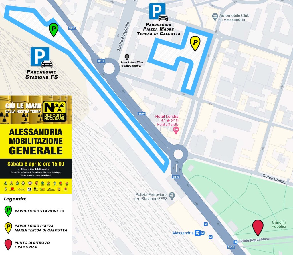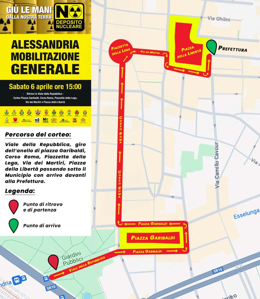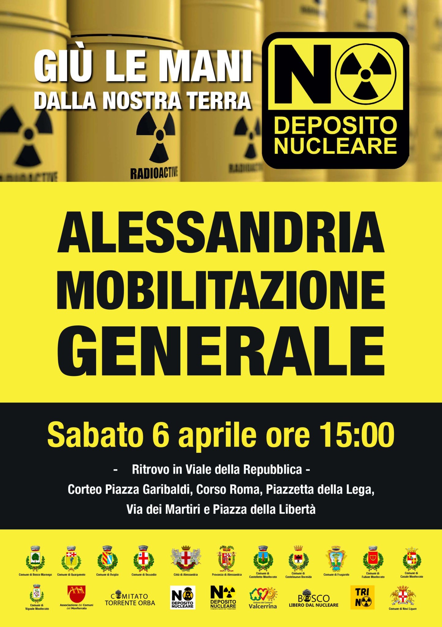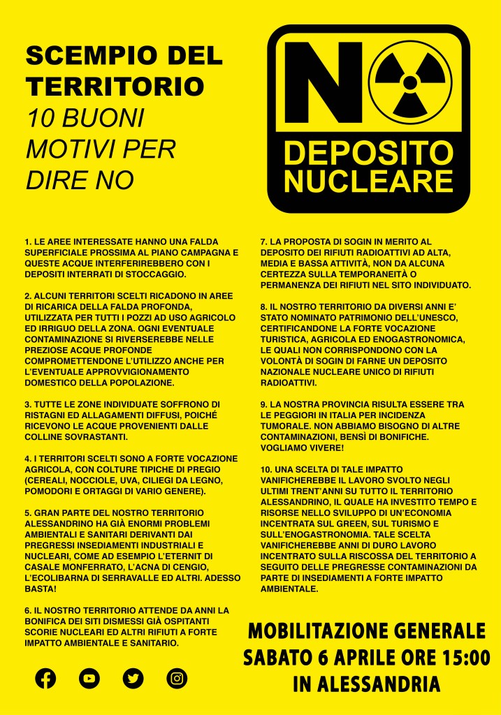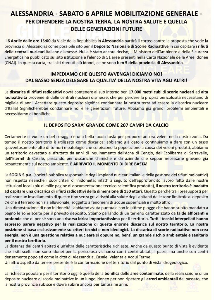 Sabato 6 Aprile 2024 dalle ore 15:00 partirà il corteo composto da Cittadini, Sindaci, Comitati, Associazioni e rappresentanti vari delle Istituzioni, per dire NO all’installazione del Deposito Nazionale di Scorie Radioattive nei territori della provincia di Alessandria. Ritrovo e partenza da Viale della Repubblica con destinazione davanti al palazzo della Prefettura in Piazza della Libertà.