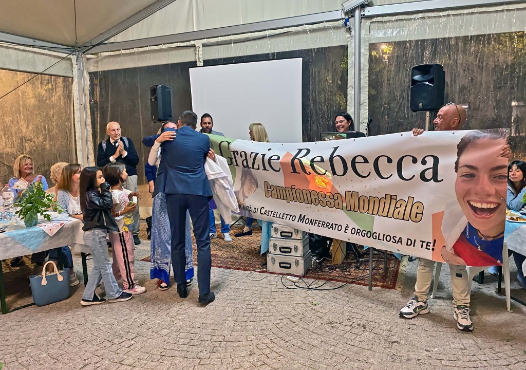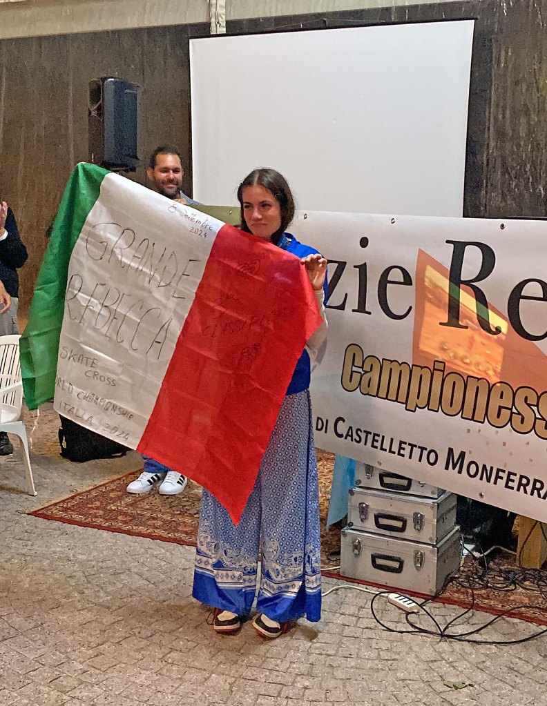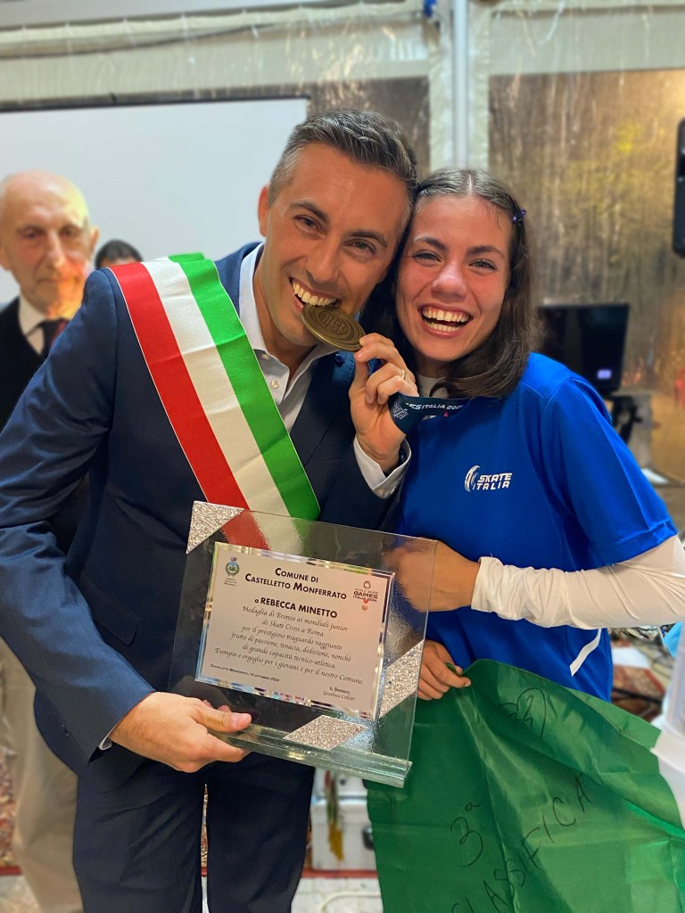 Sabato 14 settembre u.s. la popolazione di Castelletto Monferrato ha reso omaggio alla sua campionessa con una calorosa festa, per dimostrare a Rebecca tutto l’affetto e la stima a lei corrisposta. Per la prima volta in Italia a Roma dal 6 al 22 settembre c.a. si svolge il World Skate Games Italia 2024, che vede la partecipazione di atleti da tutto il mondo. La città eterna che ospita questo importante evento ha visto la partecipazione di diversi atleti azzurri, tra cui Rebecca Minetto, 17 anni, di Castelletto Monferrato. Con una prestazione eccezionale la castellettese Rebecca Minetto ha ottenuto la medaglia di bronzo al campionato mondiale junior di Skate Cross nell’ambito dei World Skate Games Italia 2024. L’impressionante cornice del Pincio, nel cuore di Roma, ha ospitato le adrenaliniche gare nel complicato percorso fatto di gincane, rampe ed ostacoli. Circa 130 atleti provenienti da tutto il mondo si sono alternati nell’insidioso tracciato sotto gli occhi affascinati di turisti, appassionati e addetti ai lavori. Già durante le qualifiche nella mattinata di domenica 8 settembre la castellettese aveva fornito una prestazione eccellente. La conferma più straordinaria è arrivata nel pomeriggio di domenica con la conquista del bronzo della nostra azzurra Rebecca Minetto. Siamo orgogliosi della nostra compaesana Rebecca, l’abbiamo vista crescere sin da bambina e rappresenta senza alcun dubbio un esempio positivo per le nuove generazioni – commenta il Sindaco di Castelletto Monferrato, Gianluca Colletti. La sua voglia di crescere, unitamente al sacrificio ed alla grande educazione e responsabilità trasmessele dalla sua famiglia, hanno fatto di lei una vera campionessa. Voglio esprimere tutta la gioia degli abitanti di Castelletto Monferrato per questo grande risultato ottenuto, in Rebecca vediamo il futuro del nostro paese – conclude il Sindaco Gianluca Colletti.