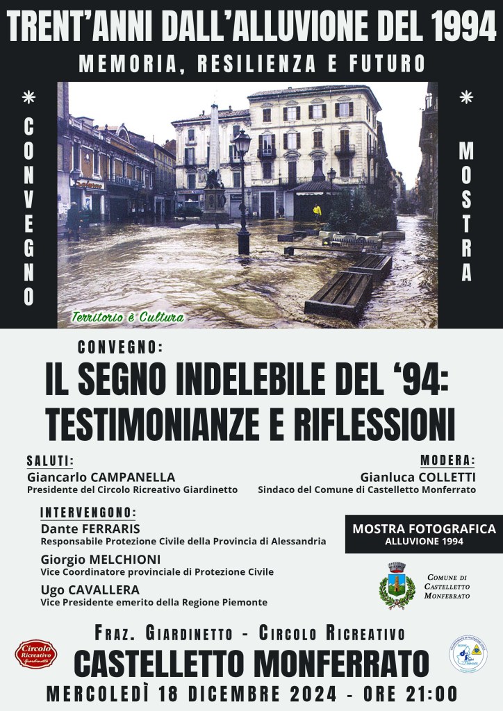 – Mercoledì 18 dicembre: convegno “Trent’anni dall’ Alluvione 1994” presso Circolo Ricreativo Giardinetto.