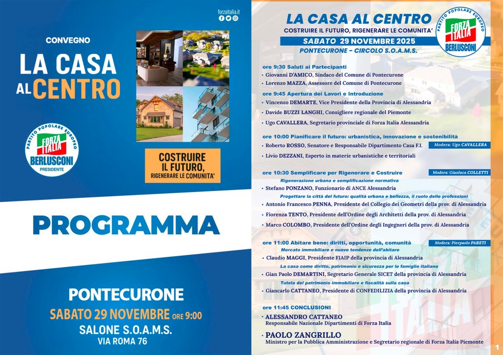 Sabato 29 Novembre a Pontecurone, si terrà l’importante convegno “La Casa al Centro: costruire il futuro, rigenerare le comunità”, riguardante una delle tematiche considerate sacre da Forza Italia e dal Presidente Silvio Berlusconi.