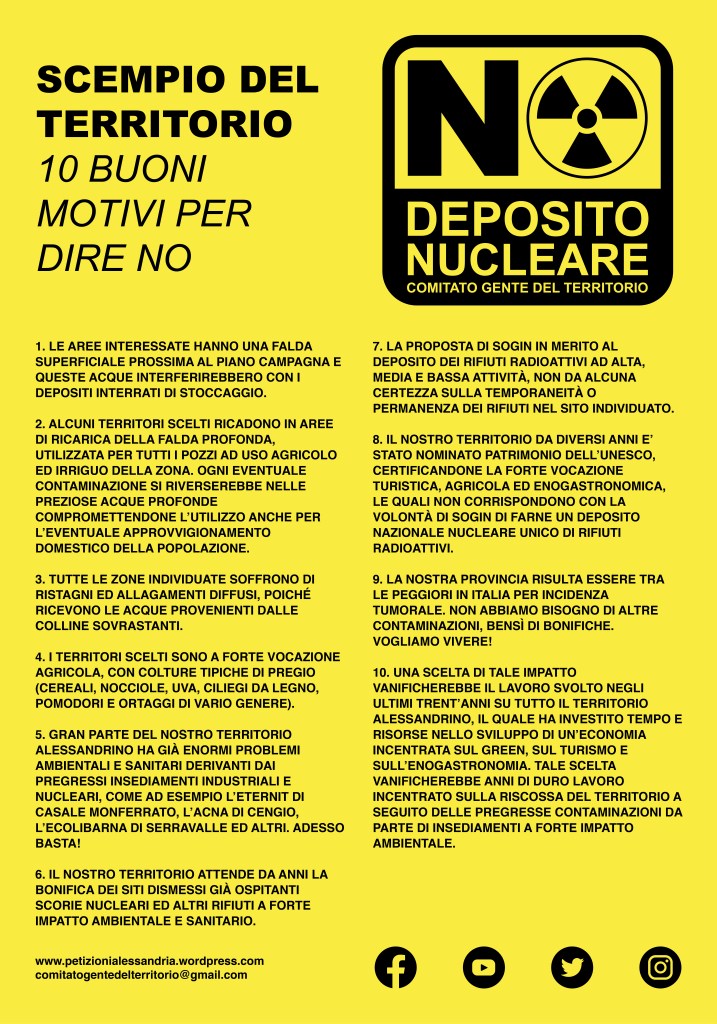 N.B. E’ POSSIBILE FIRMARE LA PETIZIONE “NO DEPOSITO NUCLEARE” IN TUTTI I COMUNI DELLA PROVINCIA DI ALESSANDRIA PRESSO LE RISPETTIVE SEDI MUNICIPALI.