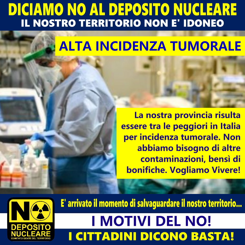 9. LA NOSTRA PROVINCIA RISULTA ESSERE TRA LE PEGGIORI IN ITALIA PER INCIDENZA TUMORALE. NON ABBIAMO BISOGNO DI ALTRE CONTAMINAZIONI, BENSÌ DI BONIFICHE. VOGLIAMO VIVERE!