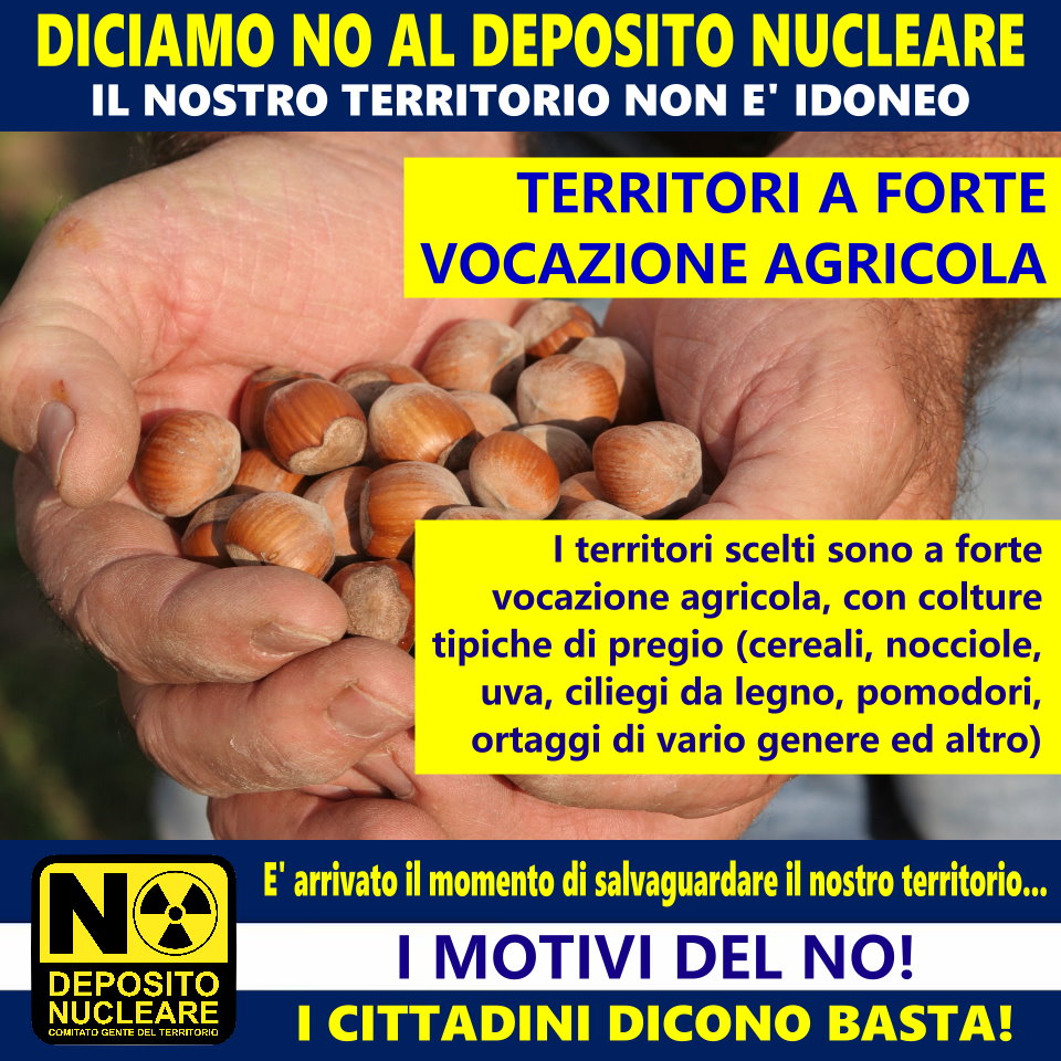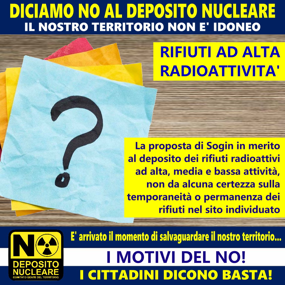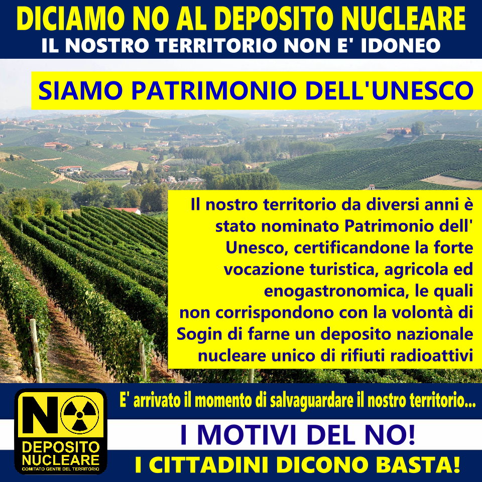 Il Comitato NO DEPOSITO NUCLEARE “Gente del Territorio” di Castelletto Monferrato, si è adoperato al fine di sintetizzare in dieci punti le motivazioni oggettive che inducono non solo gli amministratori locali, bensì tutti i soggetti coinvolti direttamente a dire NO alla proposta di SOGIN S.p.a. all’eventuale insediamento di un sito nazionale unico di scorie radioattive sul nostro territorio alessandrino.