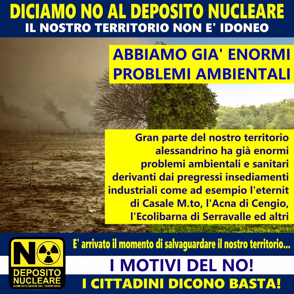 5. GRAN PARTE DEL NOSTRO TERRITORIO ALESSANDRINO HA GIÀ ENORMI PROBLEMI AMBIENTALI E SANITARI DERIVANTI DAI PREGRESSI INSEDIAMENTI INDUSTRIALI E NUCLEARI, COME AD ESEMPIO L’ETERNIT DI CASALE MONFERRATO, L’ACNA DI CENGIO, L’ECOLIBARNA DI SERRAVALLE ED ALTRI. ADESSO BASTA!