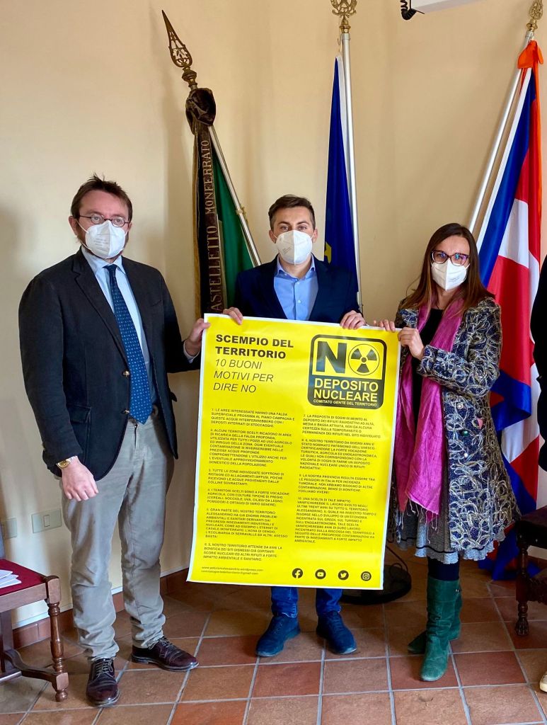 Sabato 13 marzo u.s. presso la sede municipale di Castelletto Monferrato alla presenza del Sindaco Gianluca Colletti, i comitati del NO al DEPOSITO NUCLEARE “Gente del Territorio” e “Bosco Libero dal Nucleare” si sono incontrati per approfondire insieme le prossime attività da perseguire sul territorio della Provincia di Alessandria. L’unione fa la forza – commenta il Sindaco Gianluca Colletti – sopratutto in questo momento di pandemia dove il confronto pubblico è limitato a seconda dei dati sui contagi da COVID-19. E’ stato un piacere accogliere le delegazioni dei due comitati in Municipio, i quali hanno ribadito la necessità di collaborare approfondendo insieme la tematica legata alla proposta di Sogin per l’insediamento di un deposito nucleare sul nostro territorio provinciale. All’incontro erano presenti il Presidente del Comitato “Gente del Territorio” Alessandro Provera ed il Presidente del Comitato “Bosco Libero dal Nucleare” Roberta Tornielli insieme ad una ristretta delegazione, i quali si sono resi disponibili a condividere attività ed inziative con